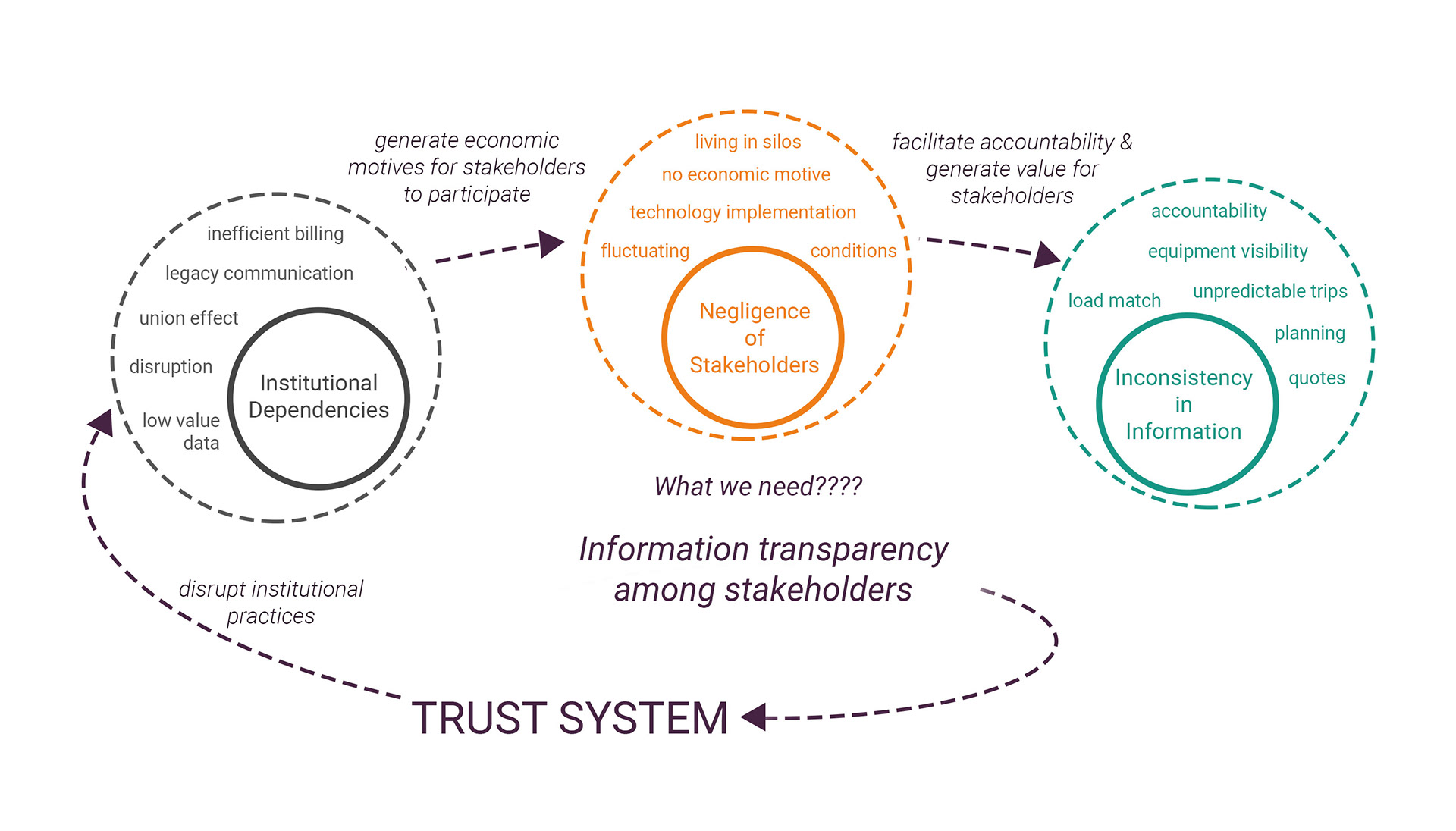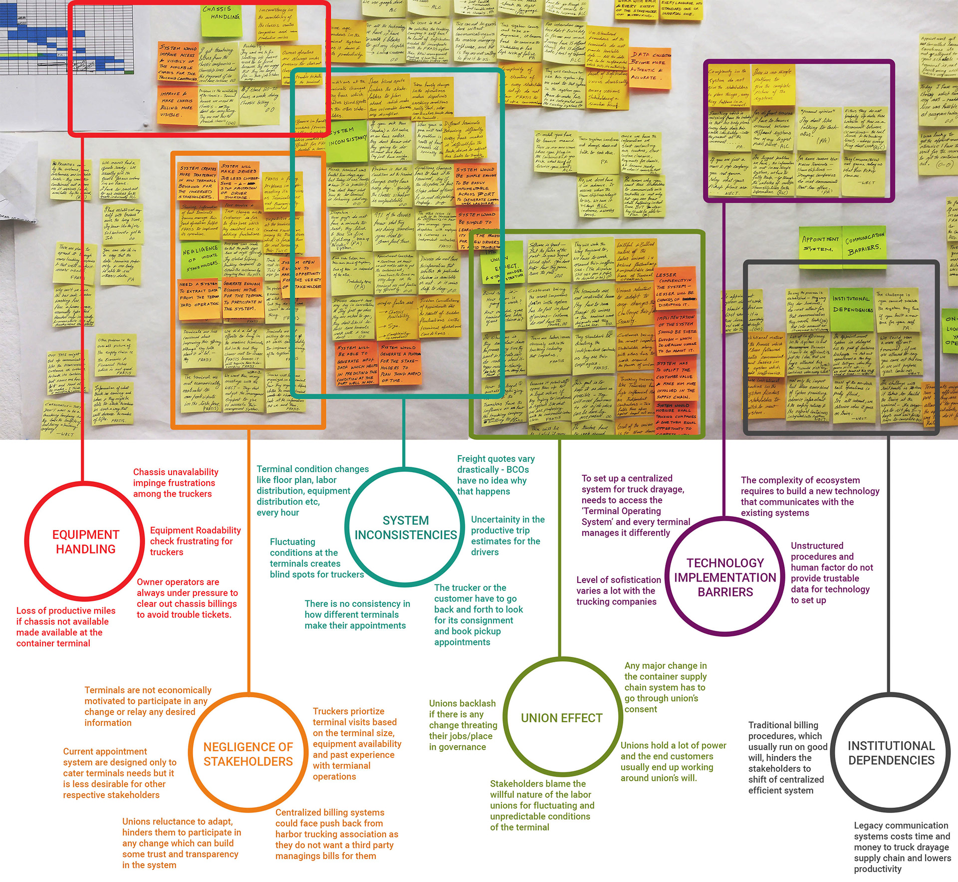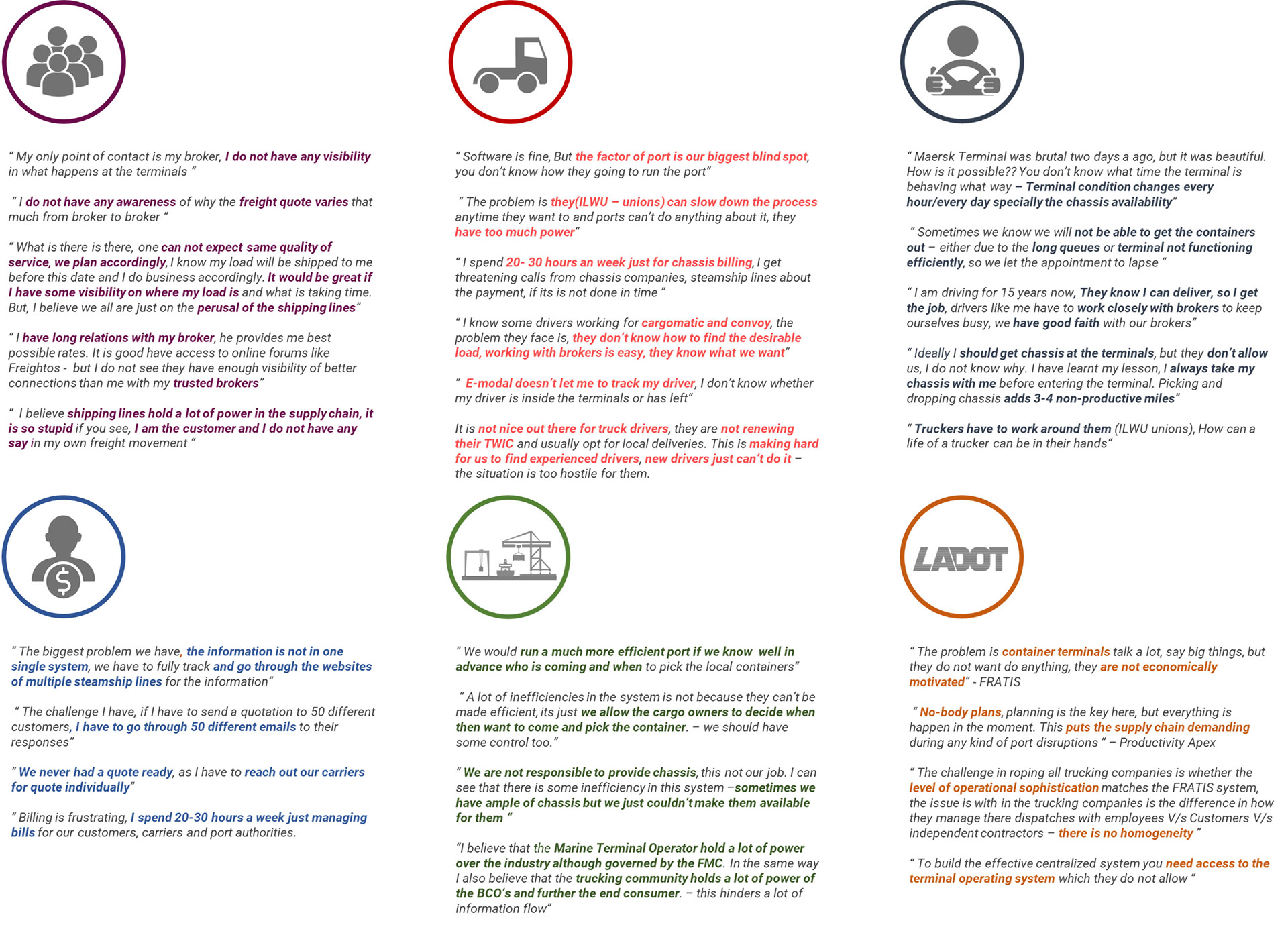 To get a deeper knowledge of the issues identified from the contextual inquiry, a series of interviews were done with trucking companies, truck drivers, freight forwarding companies, container terminal, and providers of information technology. The questions asked in this exercise were aimed to analyze the subjectivity of the information among all the potential stakeholders.