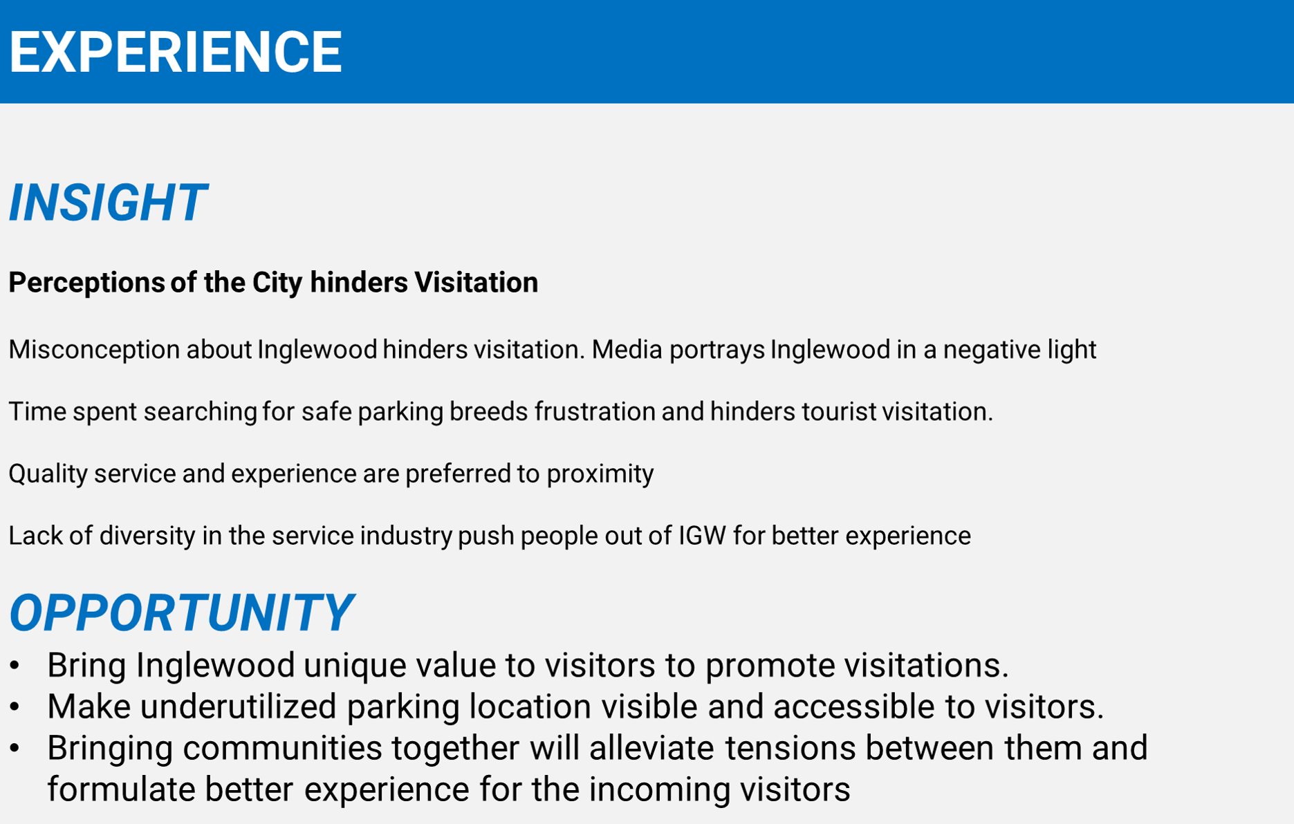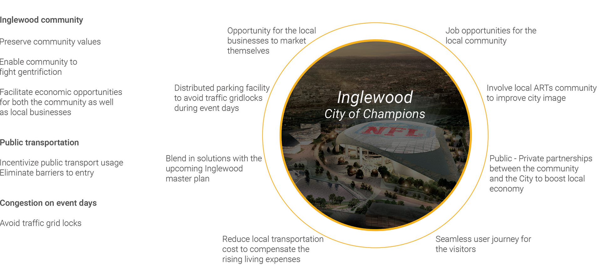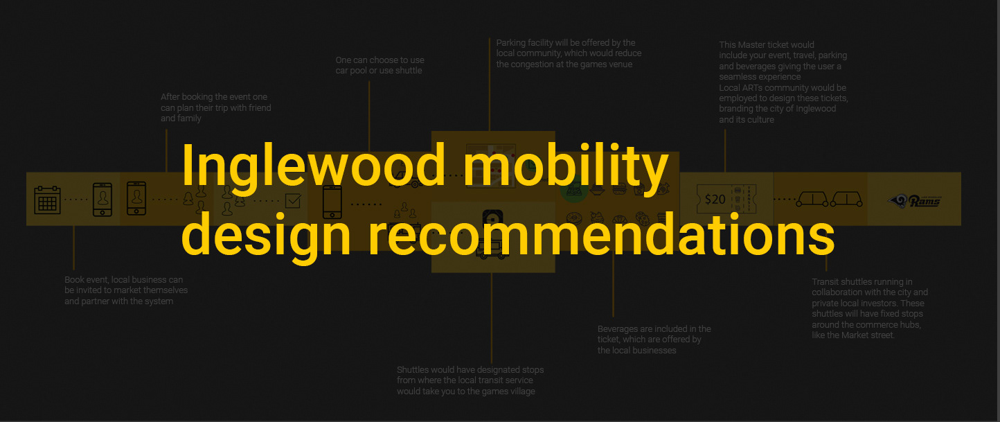 Research will be conducted on how can possible mobility methods that improves the urban experience for visitors, residents and the local workforce. And also to understand holistically the identity of Inglewood and to find the social, political and economic values that transportation can facilitate the community.
