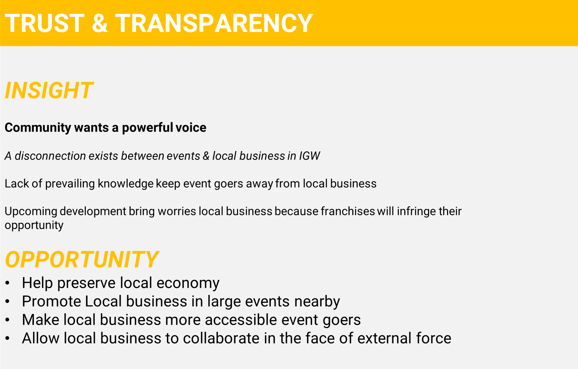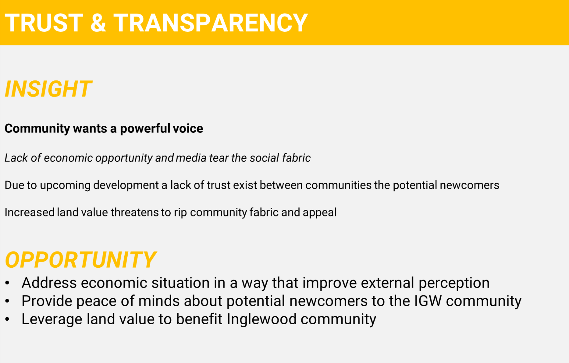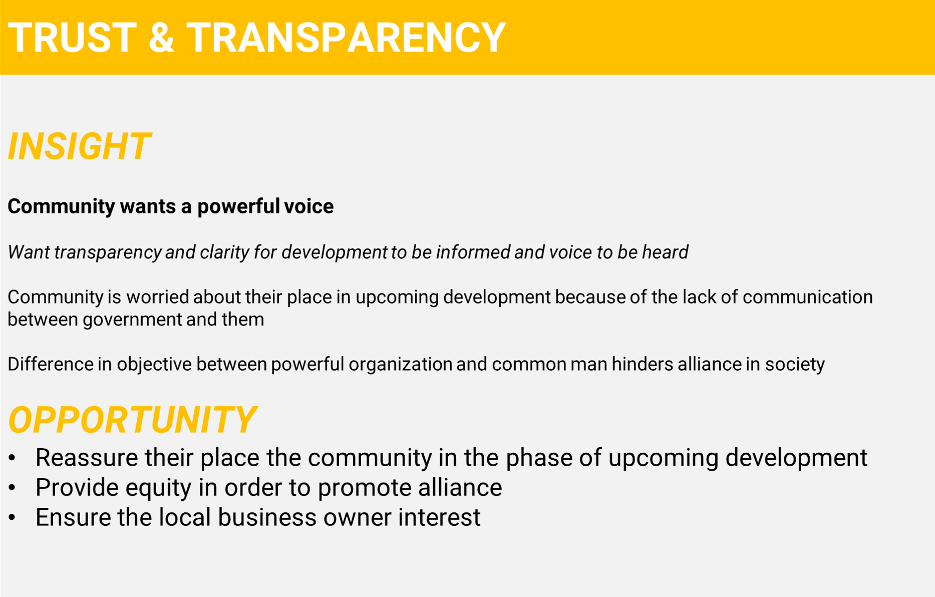 We will identify potential stakeholders and examine the human-centered needs of the community as well as the external entities.