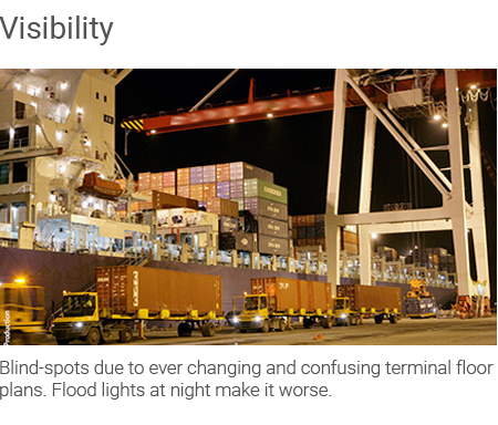 An exterior defined by heightened vehicular visibility and impact resistance to allow for secure and confident mobility around the port.